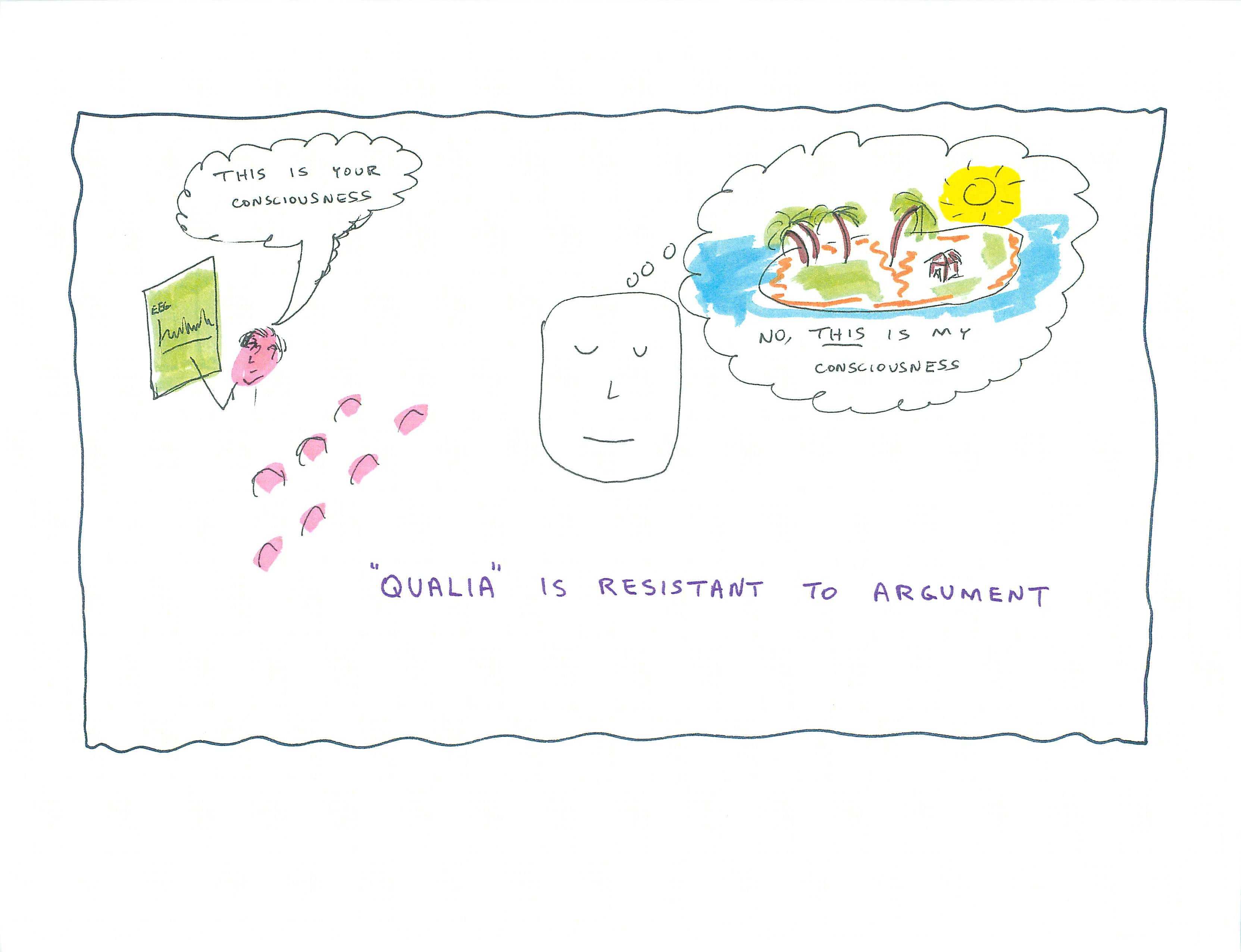 Qualia, however, is very personal and subjective. Qualia will be difficult to penetrate merely through discourse, scientific papers, or fabulous seminars.